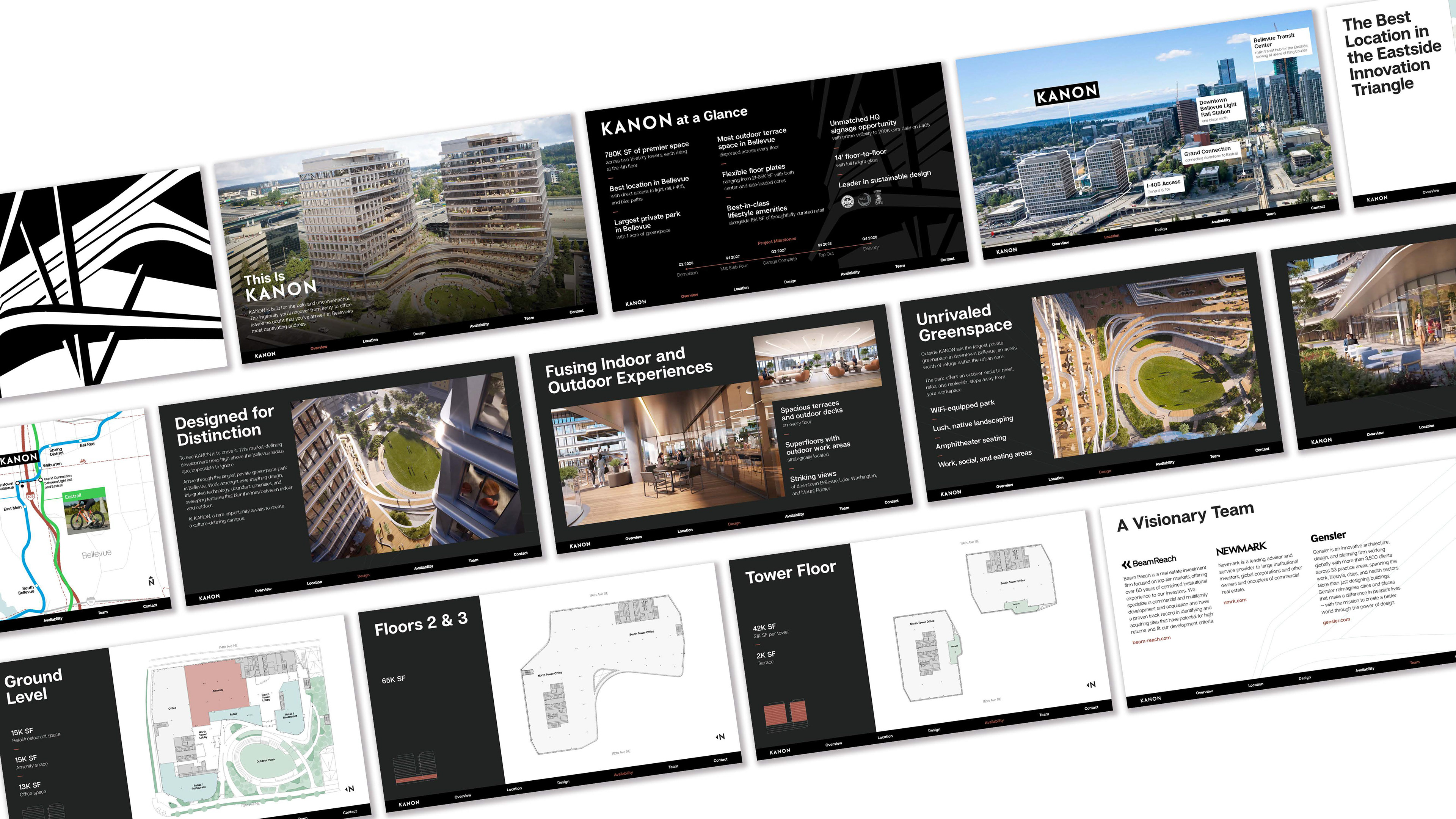 The client sought a distinctive presence in Bellevue's rapidly evolving landscape of new, modernized buildings. Their vision was ambitious: to be the "New York City of Bellevue." To achieve this, we developed a confident brand voice paired with a bold black-and-white visual identity that incorporates the signature curves of their architecture. The result is a brand that feels substantial, forward-thinking, and built for the future.