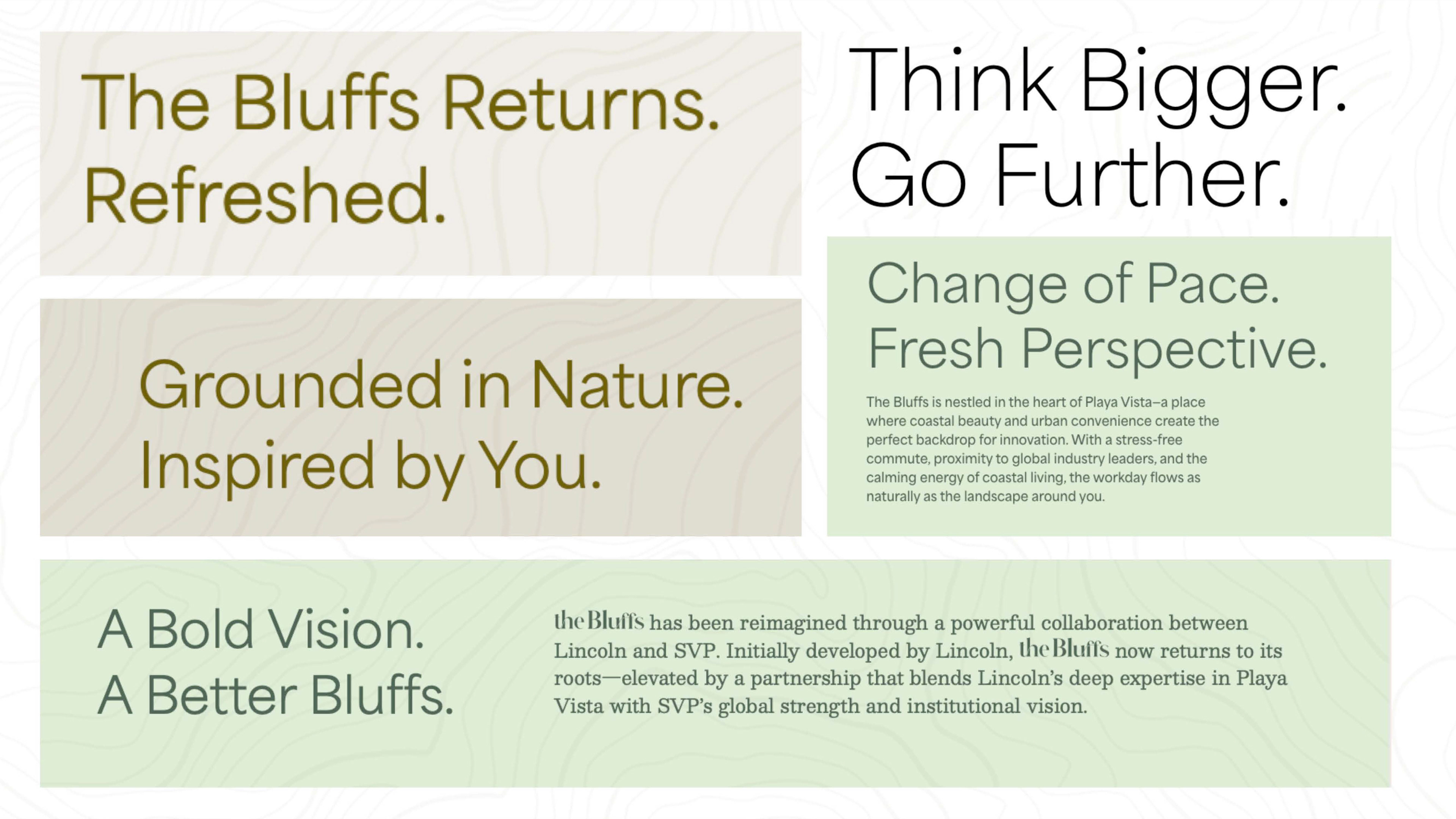 Neoscape worked closely with Lincoln to produce marketing assets for The Bluffs, a class A office development in Playa Vista, CA. This office campus is comprised of two buildings, with 500k RSF of space. The spaces focus on bringing outdoors in and indoors out. The various amenities include private tenant terraces, tenant work lounges, multiple on-campus restaurants, gym, and a conference center.
